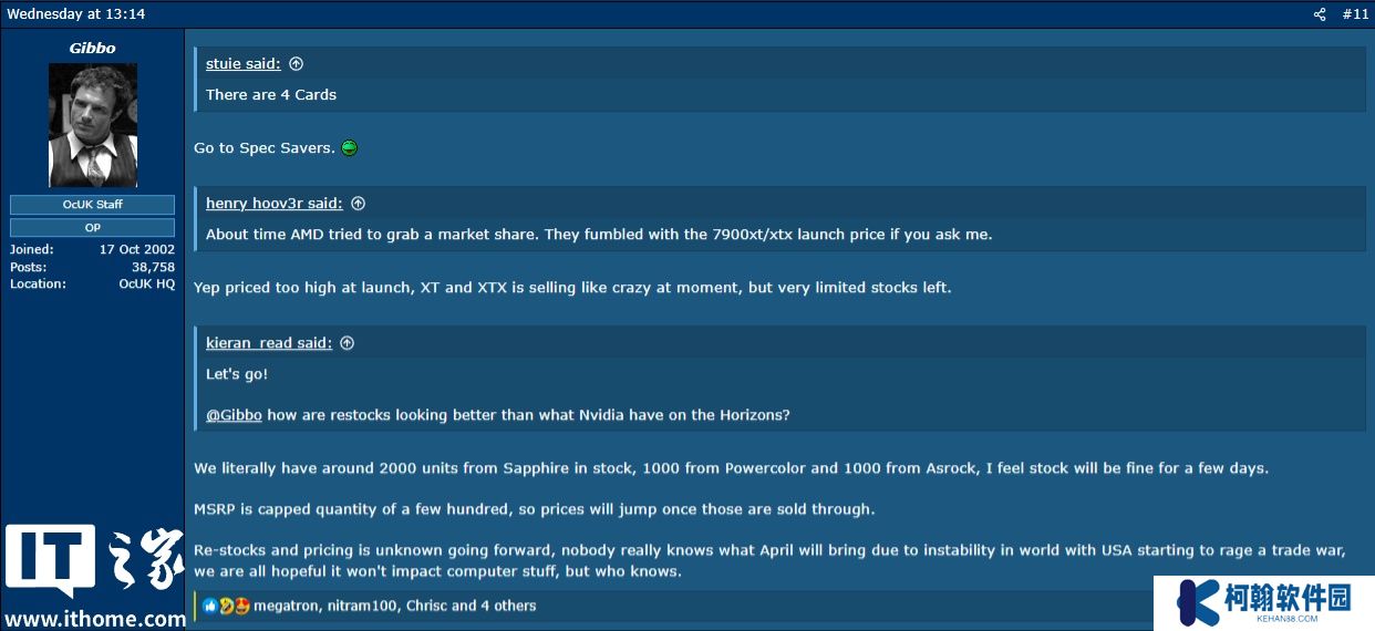 本站注意到,英国零售商 OverClockersUK 采购主管 Andrew Gibson 同时也证实其首发批次数量有限,例如蓝宝石首批库存约 2000 片,撼讯与华擎各 1000 片。MSRP 定价仅覆盖首批货量的前几百片,后续出货价格将按厂商制定的新定价体系进行调整。