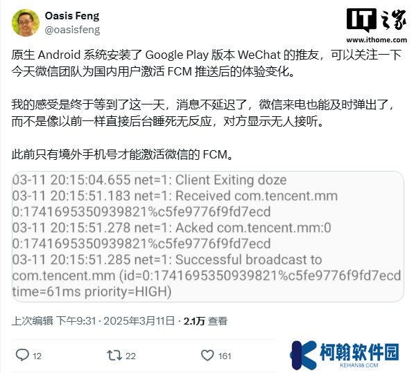 他表示:“原生安卓系统安装了谷歌 Play 版本 WeChat 的推友,可以关注一下今天微信团队为国内用户激活 FCM 推送后的体验变化。”并提醒此前只有境外手机号才能激活微信的 FCM。这位开发者在群聊中表示:“游说微信团队半年多后,终于迎来转机了。”他说:“我的感受是终于等到了这一天,消息不延迟了,微信来电也能及时弹出了,而不是像以前一样直接后台睡死无反应,对方显示无人接听。”