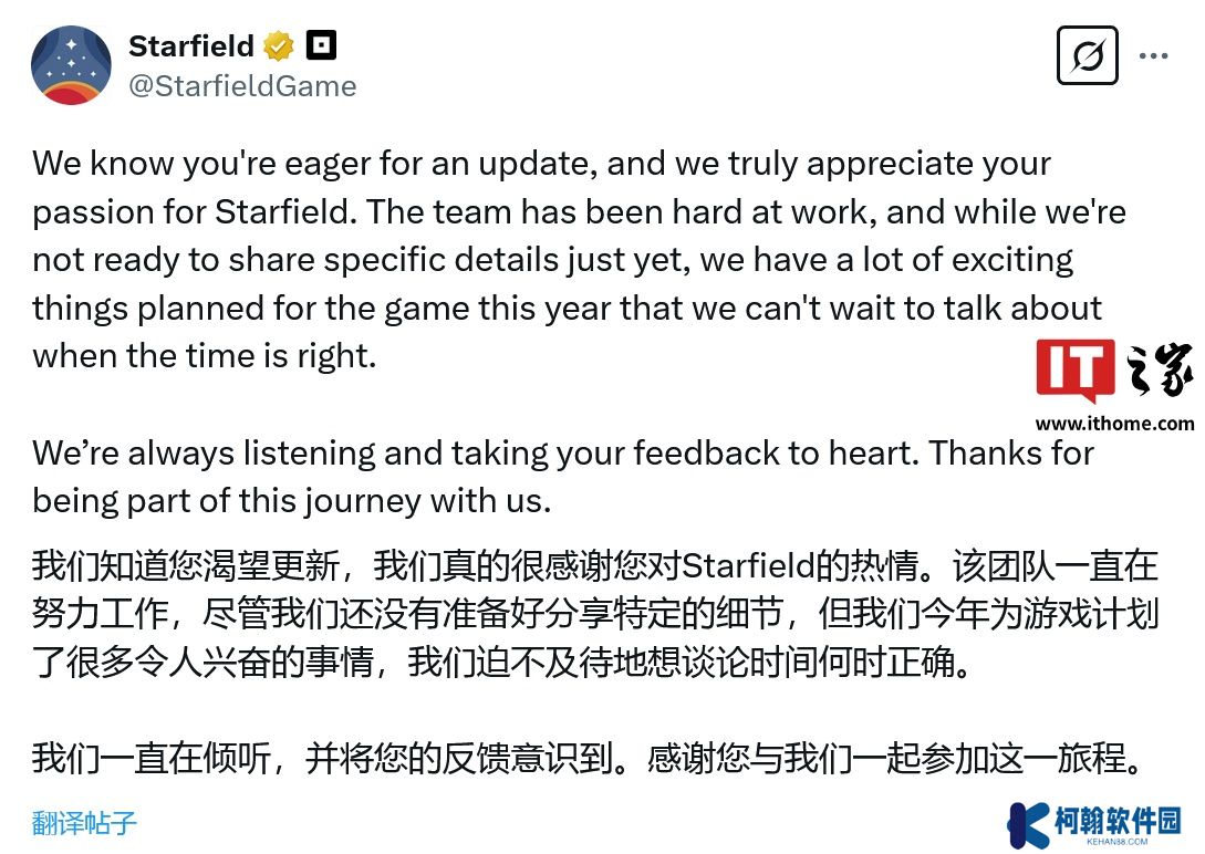 本站 3 月 7 日消息,B 社(Bethesda)昨日(3 月 6 日)在 X 平台发布推文,向《星空》(Starfield)玩家传递了积极信号,表示团队正“全力投入”,为 2025 年开发更多内容,但未透露具体细节。
