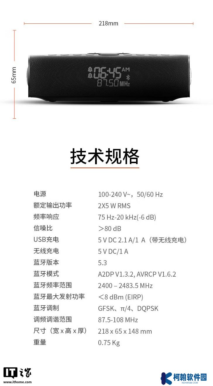 此外,这款蓝牙音箱配备接收天线,可以接收FM立体声广播,音箱顶部配备无线充电模块,但只支持5W无线充电。