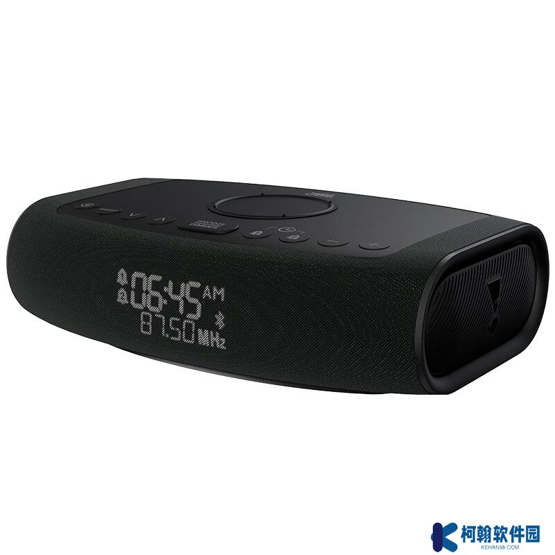 这款蓝牙音箱整体造型简洁,采用坞站式外观设计,配备可调亮度大字符 LED 显示屏,同时配有独立物理按压控件(顶部实体按键),适合放在床头使用。