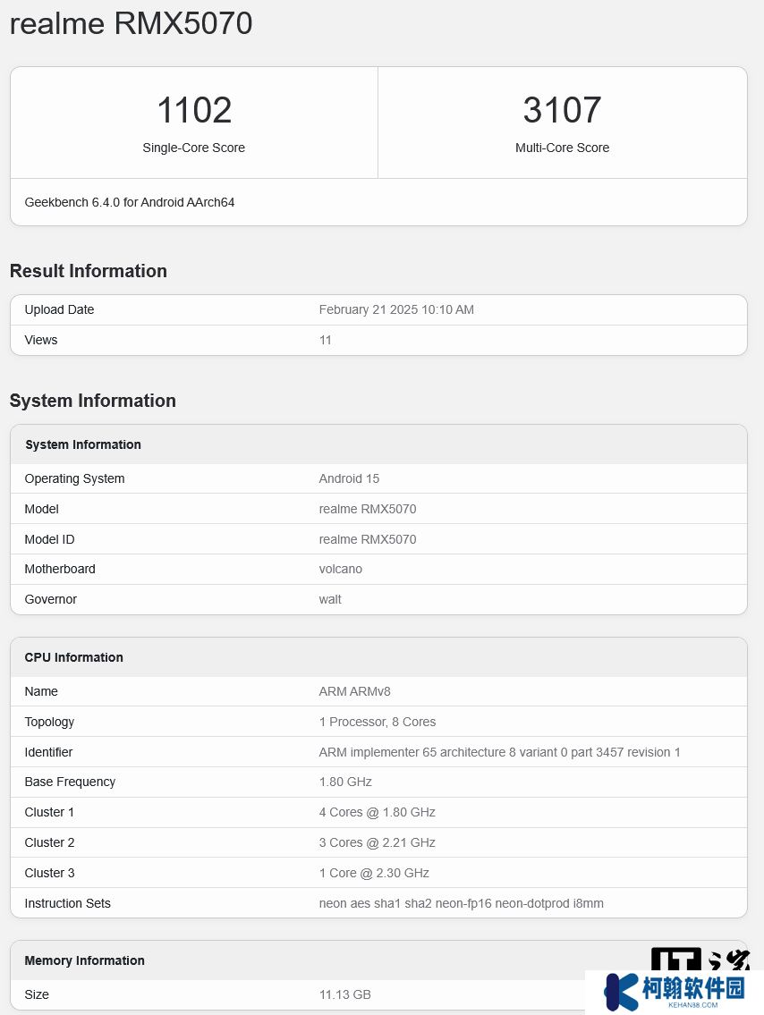 本站查询 GeekBench 跑分库,发现“RMX5070”手机搭载高通骁龙 6 Gen 4 芯片,12GB 内存,搭载安卓 15 系统。